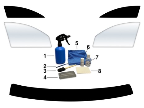 4) Kit #1, Werkzeugsatz, Sprühflasche mit Filter, Montageschaber, Mikrofasertuch, grobes Reinigungstuch,